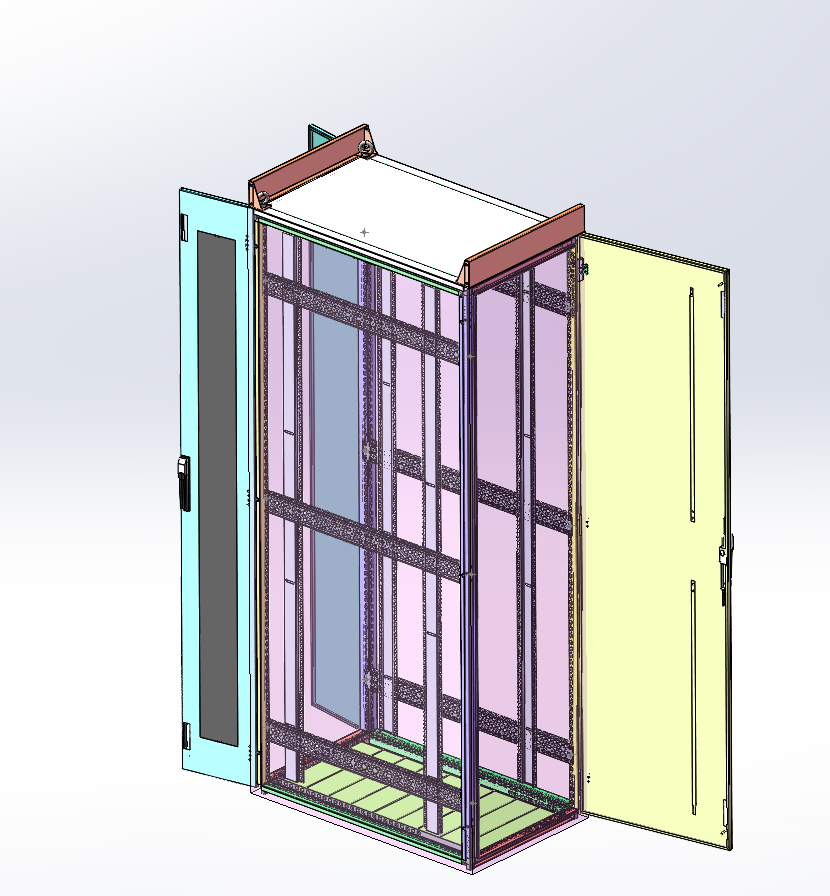 产品结构:由基本结构、内部支撑系统、布线系统、接地系统、通风系统(若需)等部分组成,其中基本结构主要包括框架、前后门、侧板、顶板、底板及相应定位、紧固件组成等。